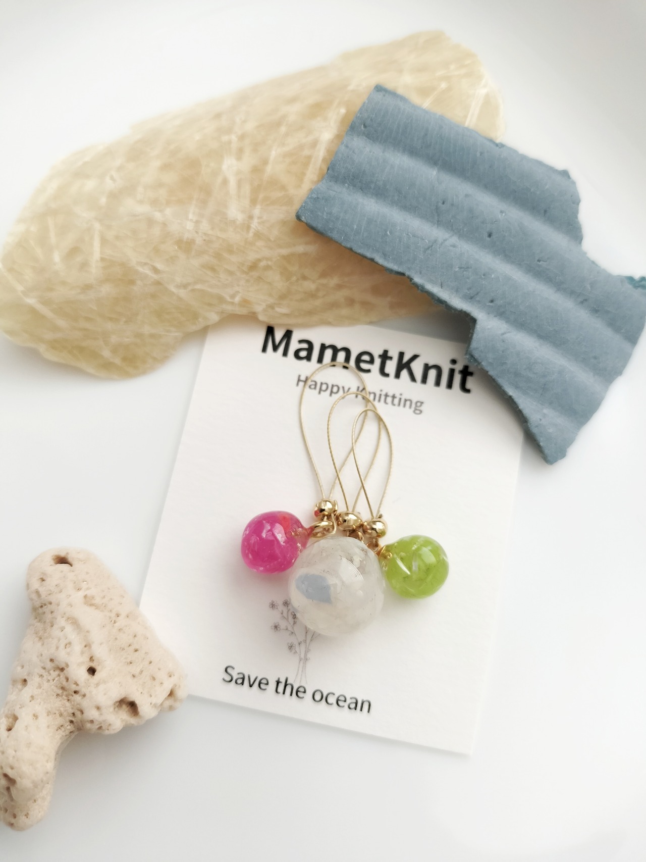 ・1つ1つすべてハンドメイドです。編み地や手を傷つけないマーカーを作るために十分なコーティングをしています。そのことによりパーツの形に多少の個体差が生じております。