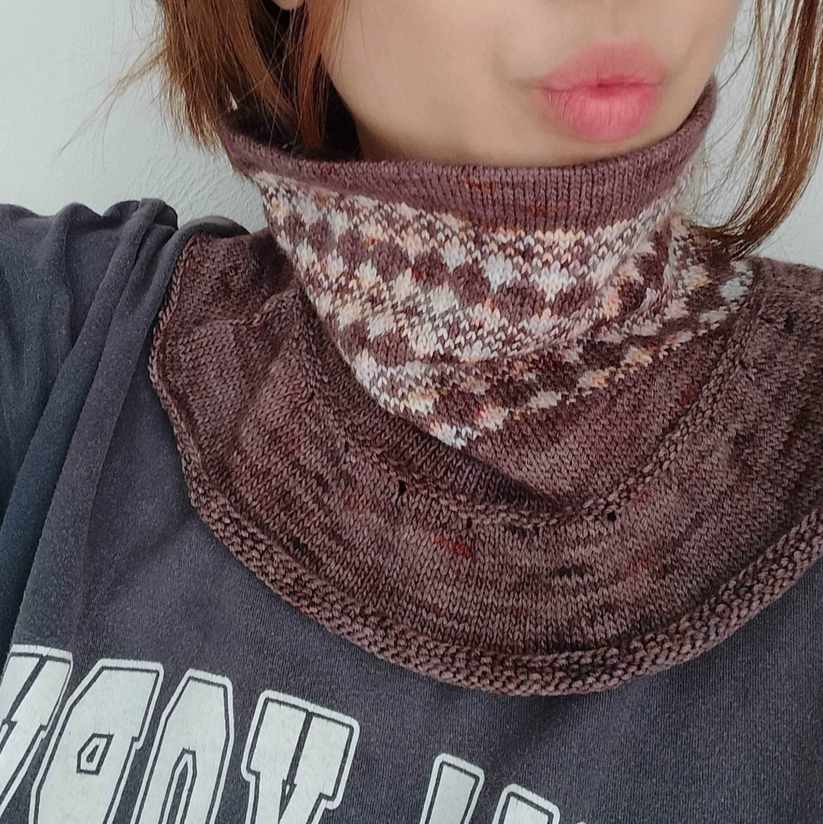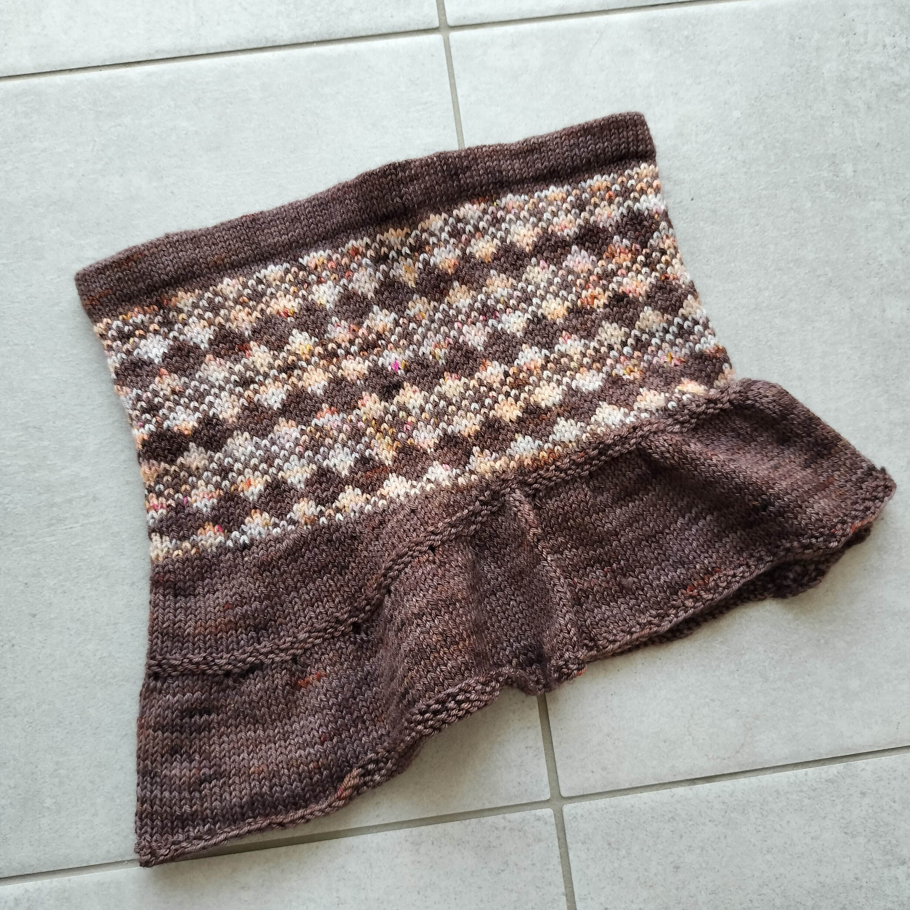 モザイクタイルの模様を取り入れたカウルです。トップダウンで編みカラーワークが終わったら、引き返しをして前後差を作り、目数を増やしてフリルを編みます。 模様の部分は編み地がしっかりするので首元を暖めてくれます。フリル部分はデコルテ部分に馴染み襟もとから入る寒さを予防してくれます。 タイル模様は二種類あるのでお好きな模様を入れて編んでください。 また同時にリリースしたMosaic tile socksを同じ糸を使って編むことができます。おそろいにしたり、模様違いを楽しんでください。Fingering 2色(それぞれ1カセ)あれば、両アイテムを編むことができます。 今からクリスマスギフトを編んでみてはいかがでしょうか。