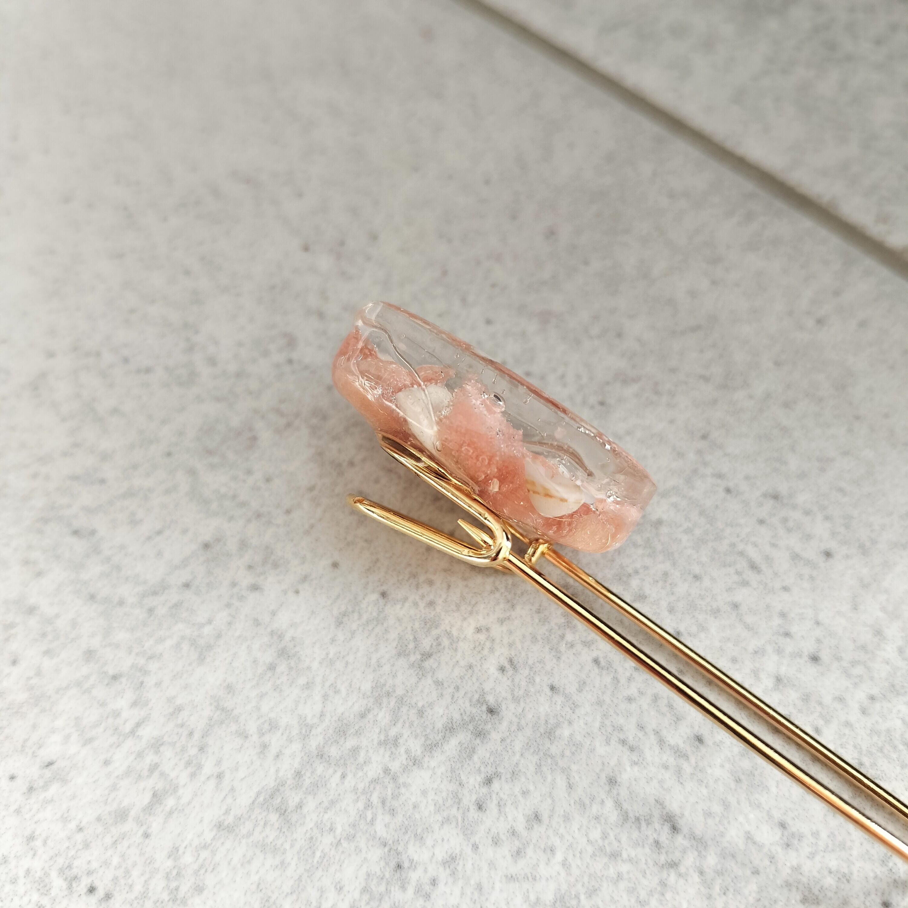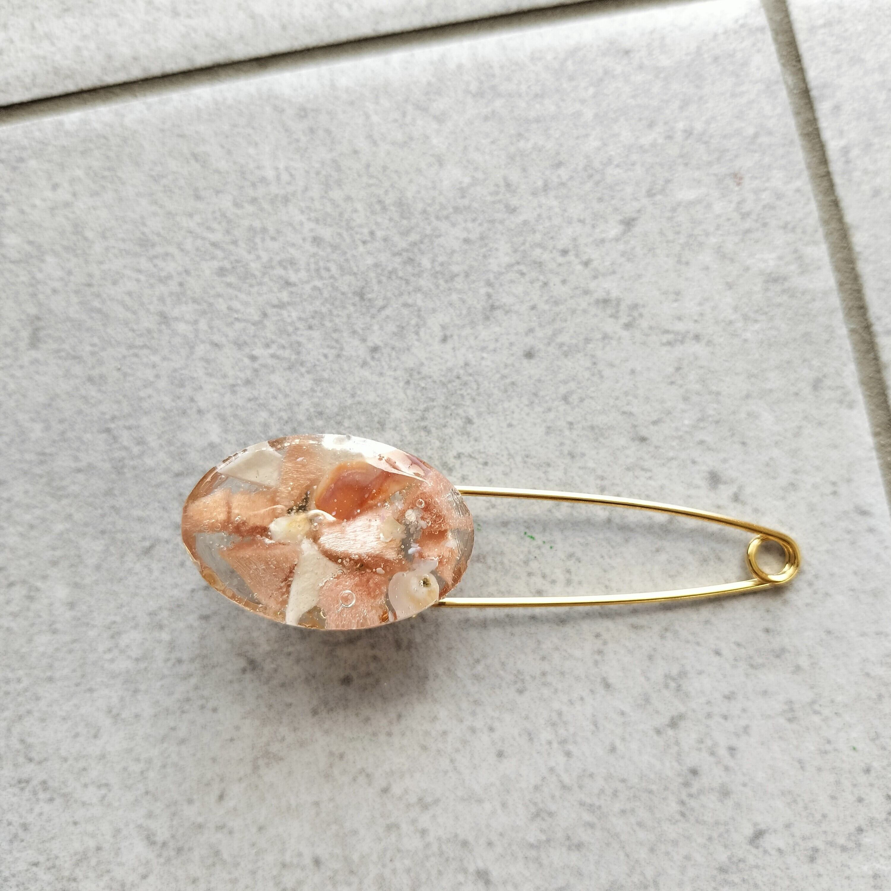 海洋プラスチックと貝殻が入ったこのピンはヌーディーな落ち着きのあるピンク色で、私はとても気に入っているので販売させていただきます。お写真をご確認いただき、アウトレット品とご理解の上、ご購入ください。