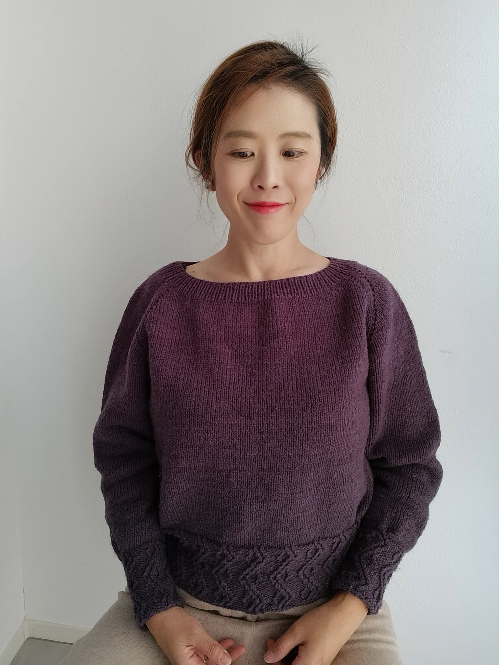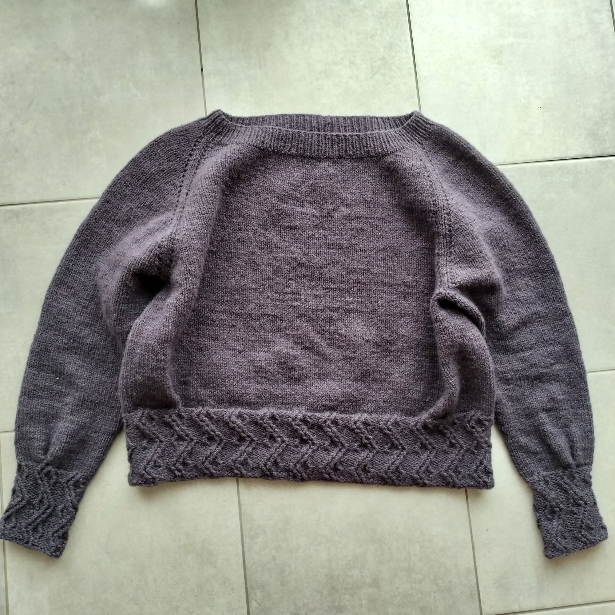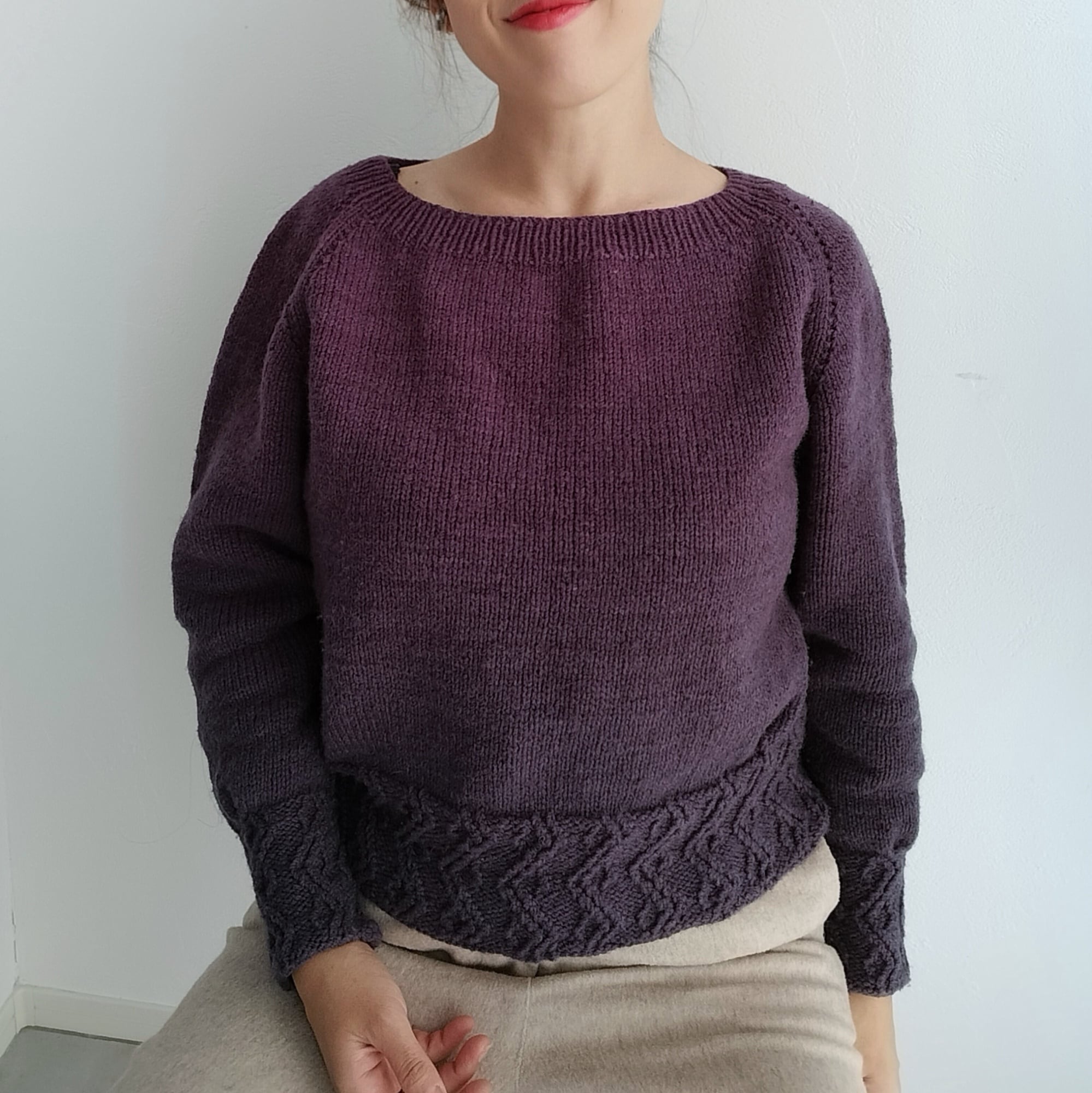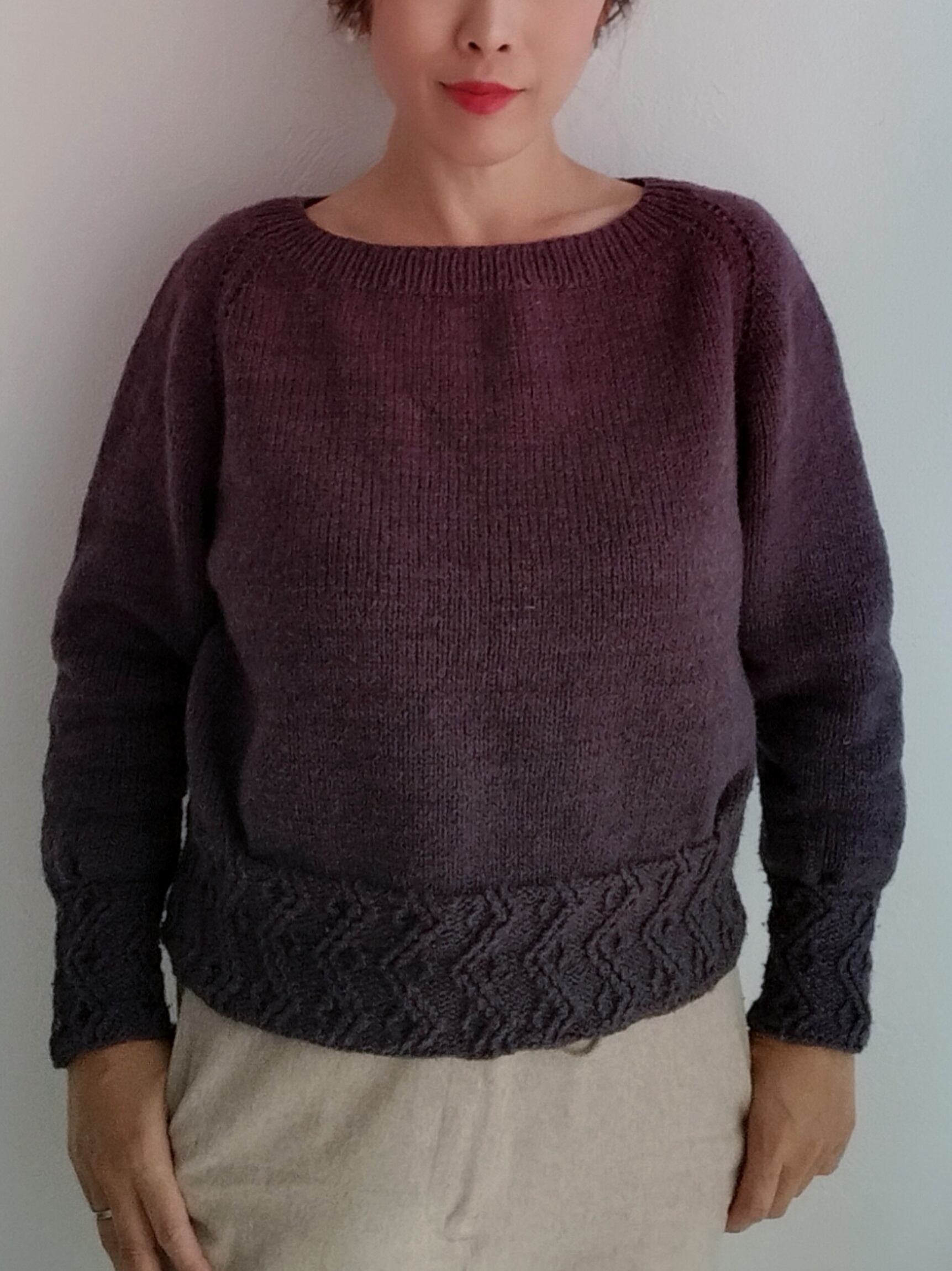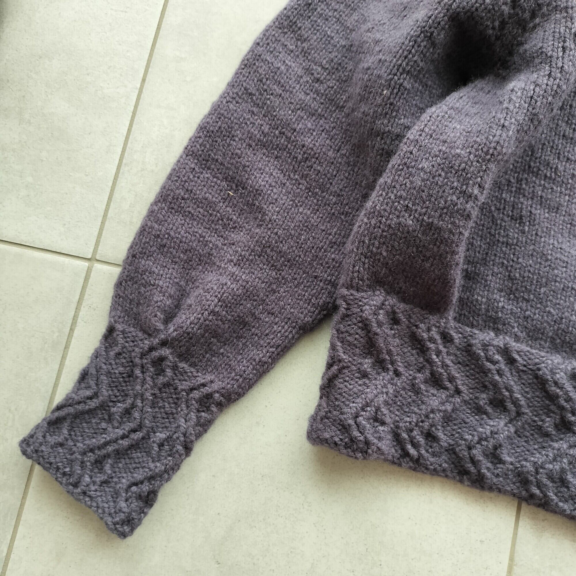襟から編み始め前後差を作り、再び輪でヨークを編みます。袖の目を休め、脇下から身頃を輪で編み、裾の手前で前身頃に二カ所のタックを作り、裾はLattice模様を編みます。袖の目を拾い、輪で袖を編みカフス手前にタックを作り、裾と同じLattice 模様のカフスを編んで完成です。