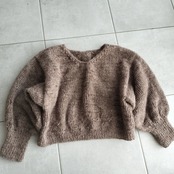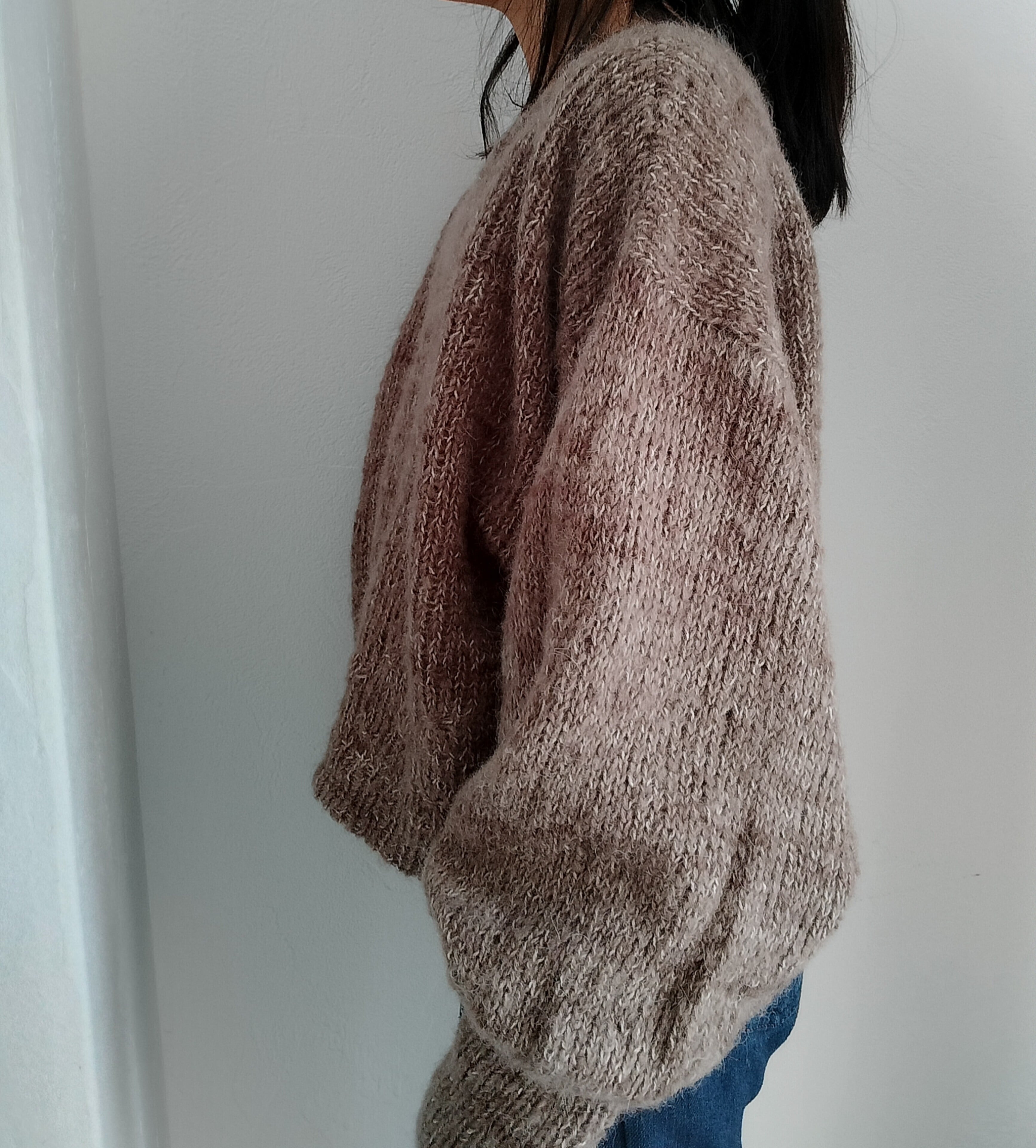裾から輪でゴム編みと、Watage stitchを編みます。前後の身頃に分けてそれぞれを往復で編み、襟はwatege stitchを編みながら形を作っていきます。目を拾って袖を編みます。 ドロップショルダーでゆとりのある形にしています。子供サイズは動きやすさに重点を置き、バストと肩幅の調整をしました。前後を逆にしても着ることができるセーターです。綿毛のイメージでサンプルはモヘアで編みました。編む糸によって表情や着心地も変わると思います。ぜひいろいろな糸で編んでみてほしいです。