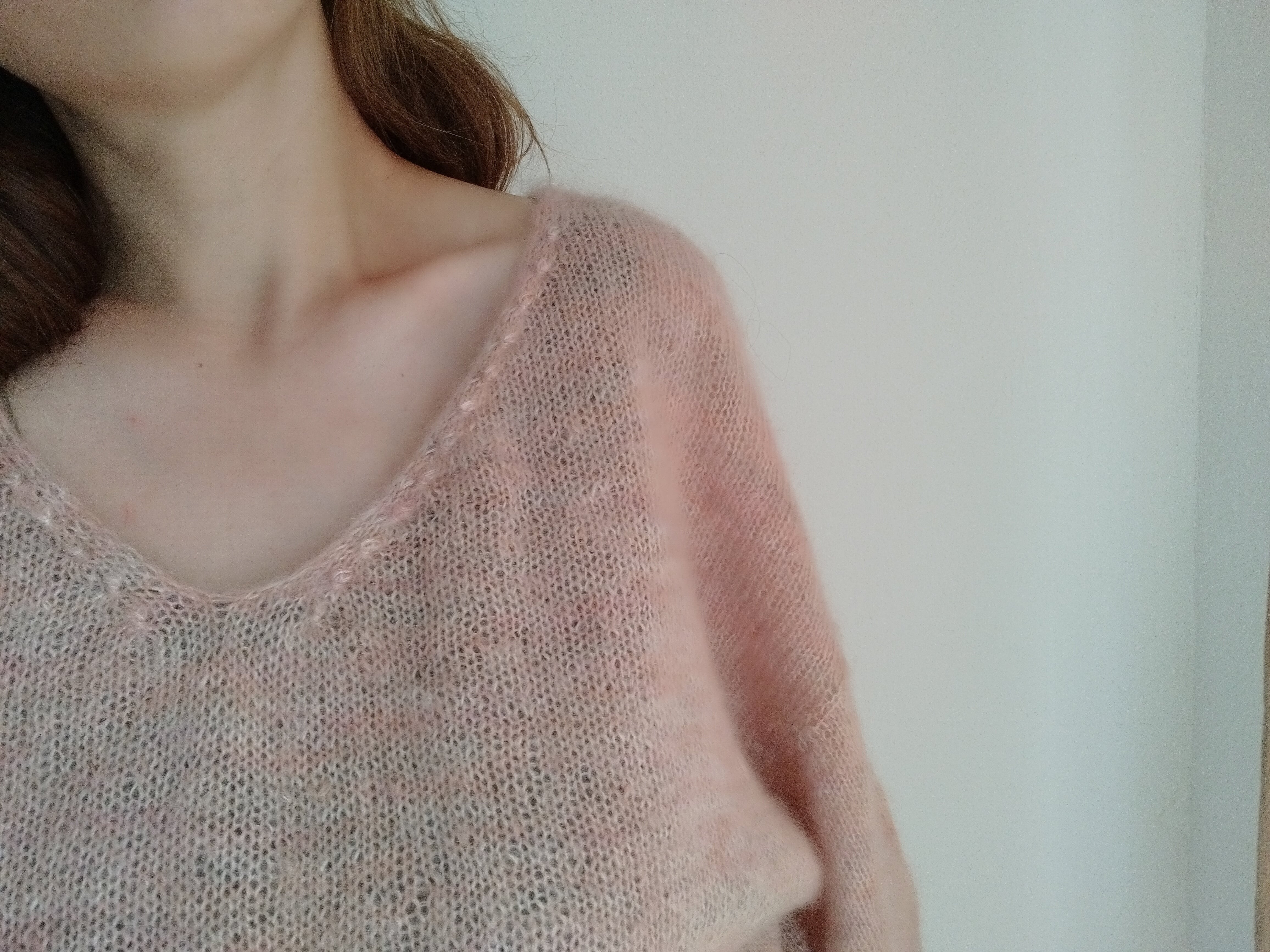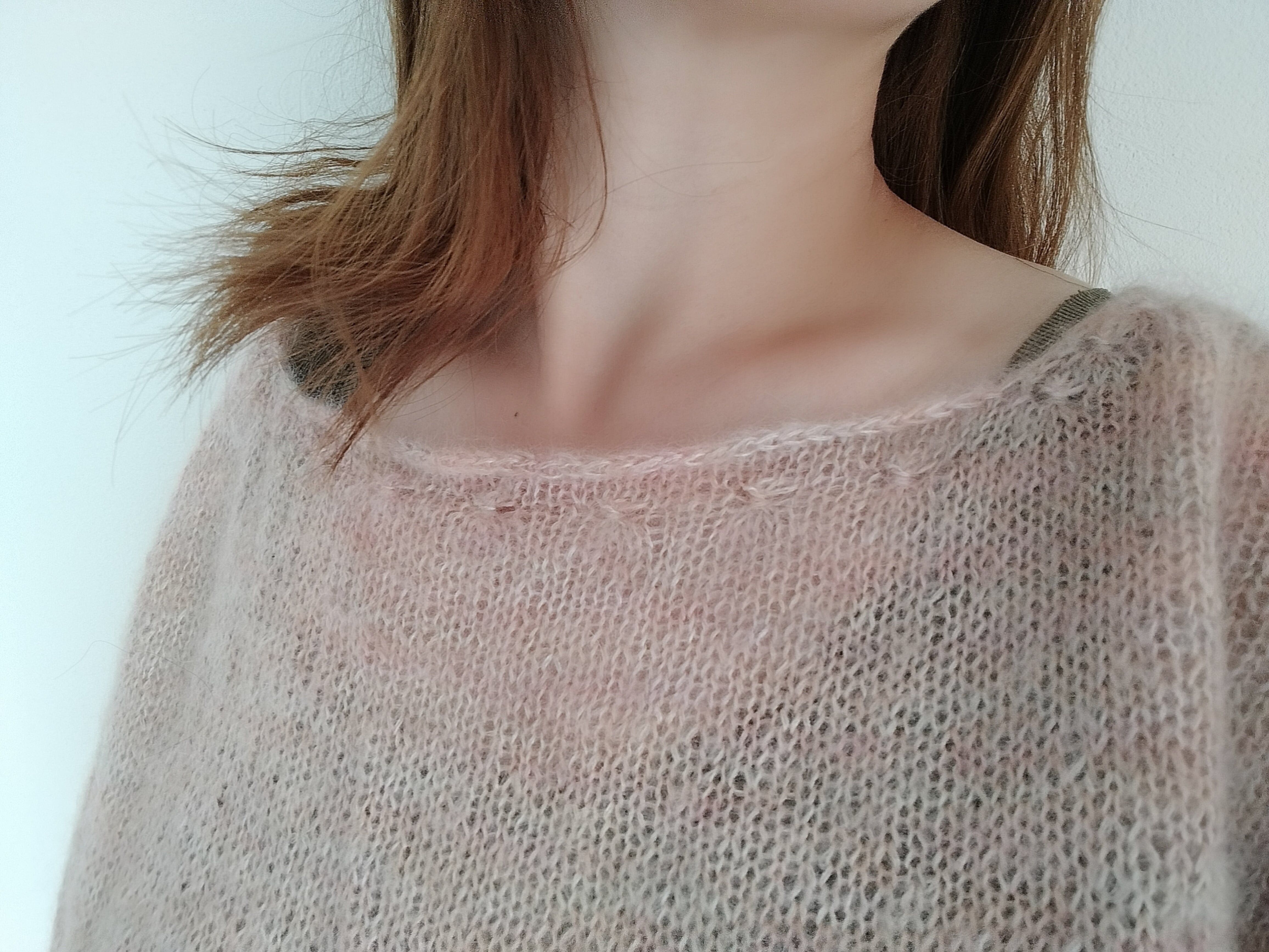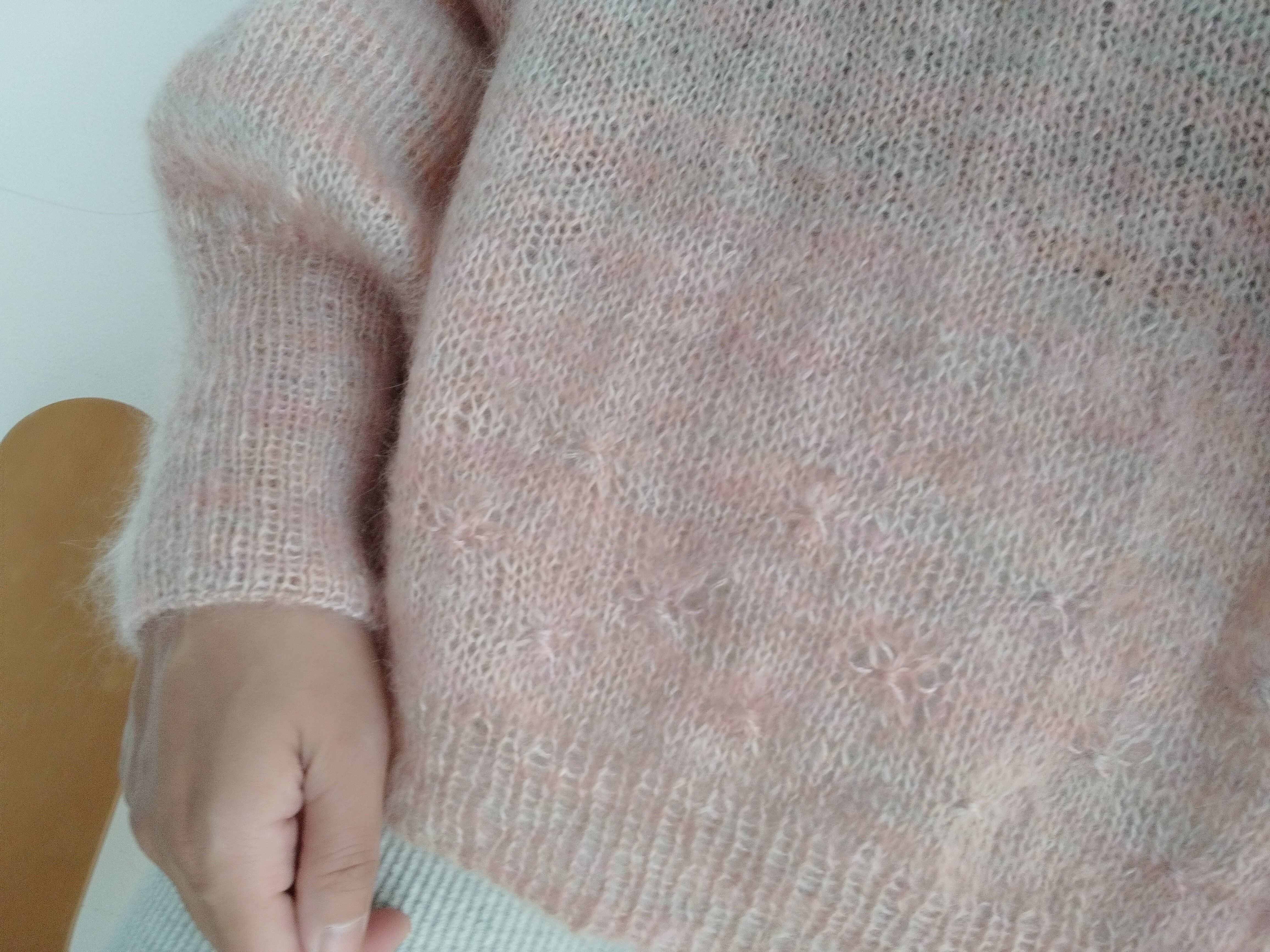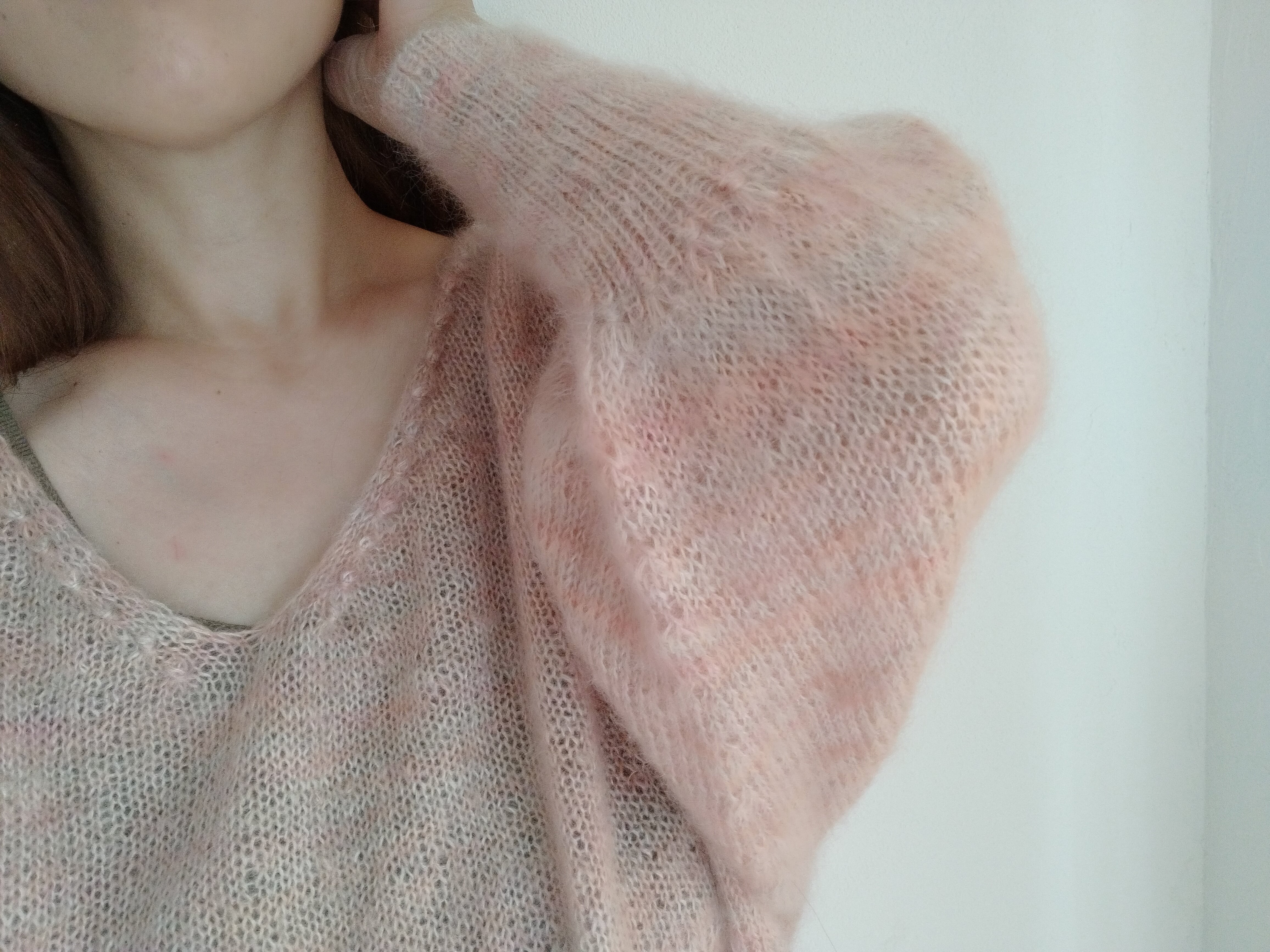 裾から輪でゴム編みと、Watage stitchを編みます。前後の身頃に分けてそれぞれを往復で編み、襟はwatege stitchを編みながら形を作っていきます。目を拾って袖を編みます。 ドロップショルダーでバストは30-40cmの余裕をもって着られる、ゆとりのある形にしています。前後を逆にしても着ることができるセーターです。綿毛のイメージでサンプルはモヘアで編みました。編む糸によって表情や着心地も変わると思います。ぜひいろいろな糸で編んでみてほしいです。