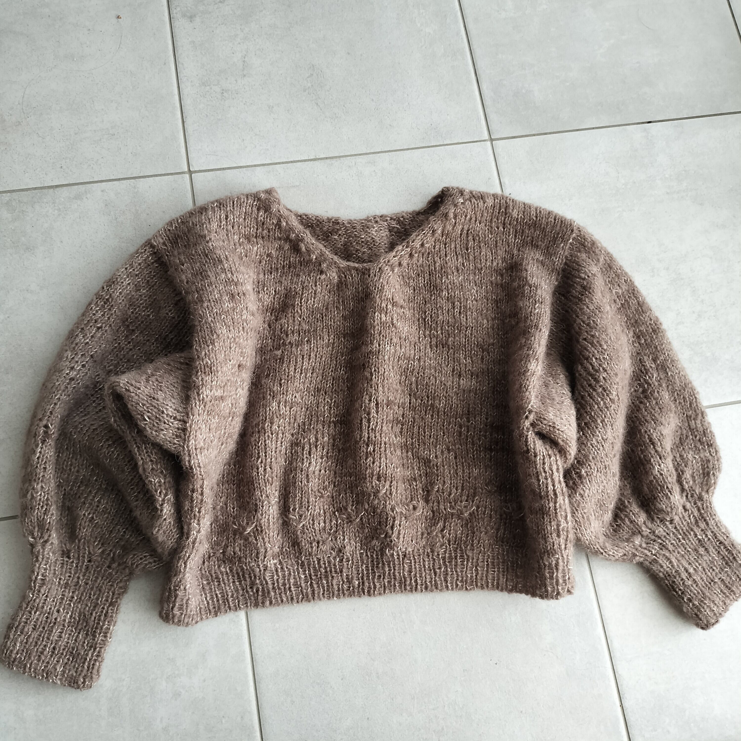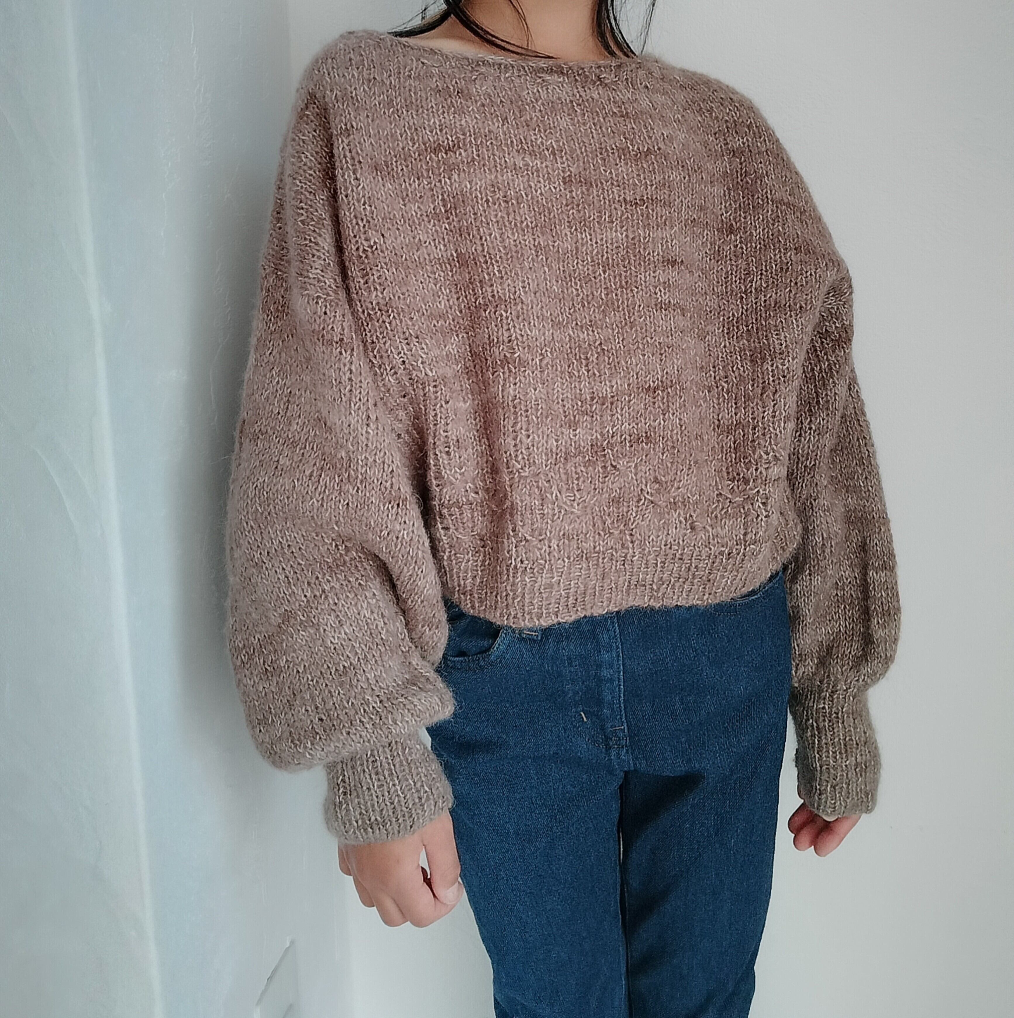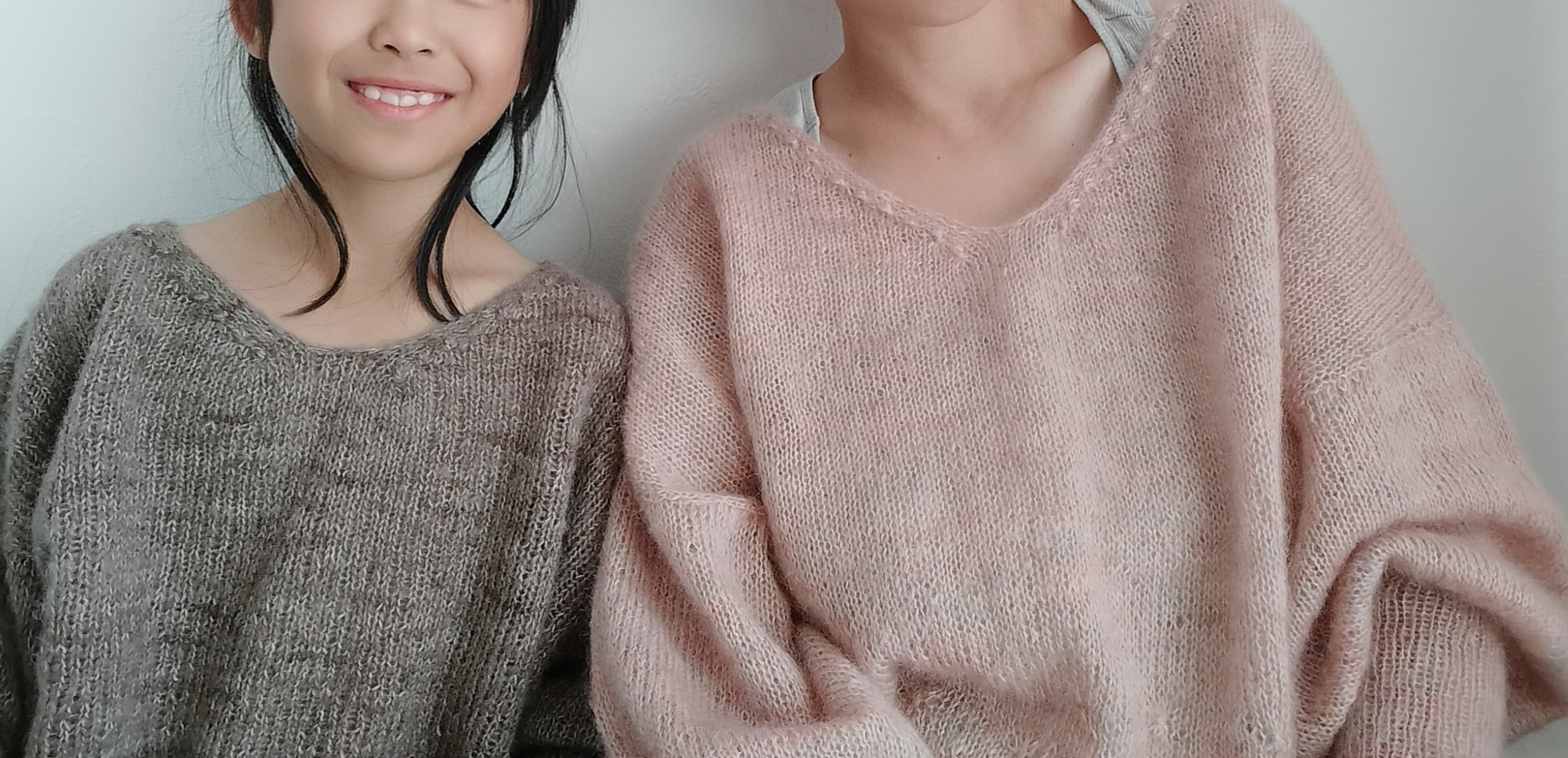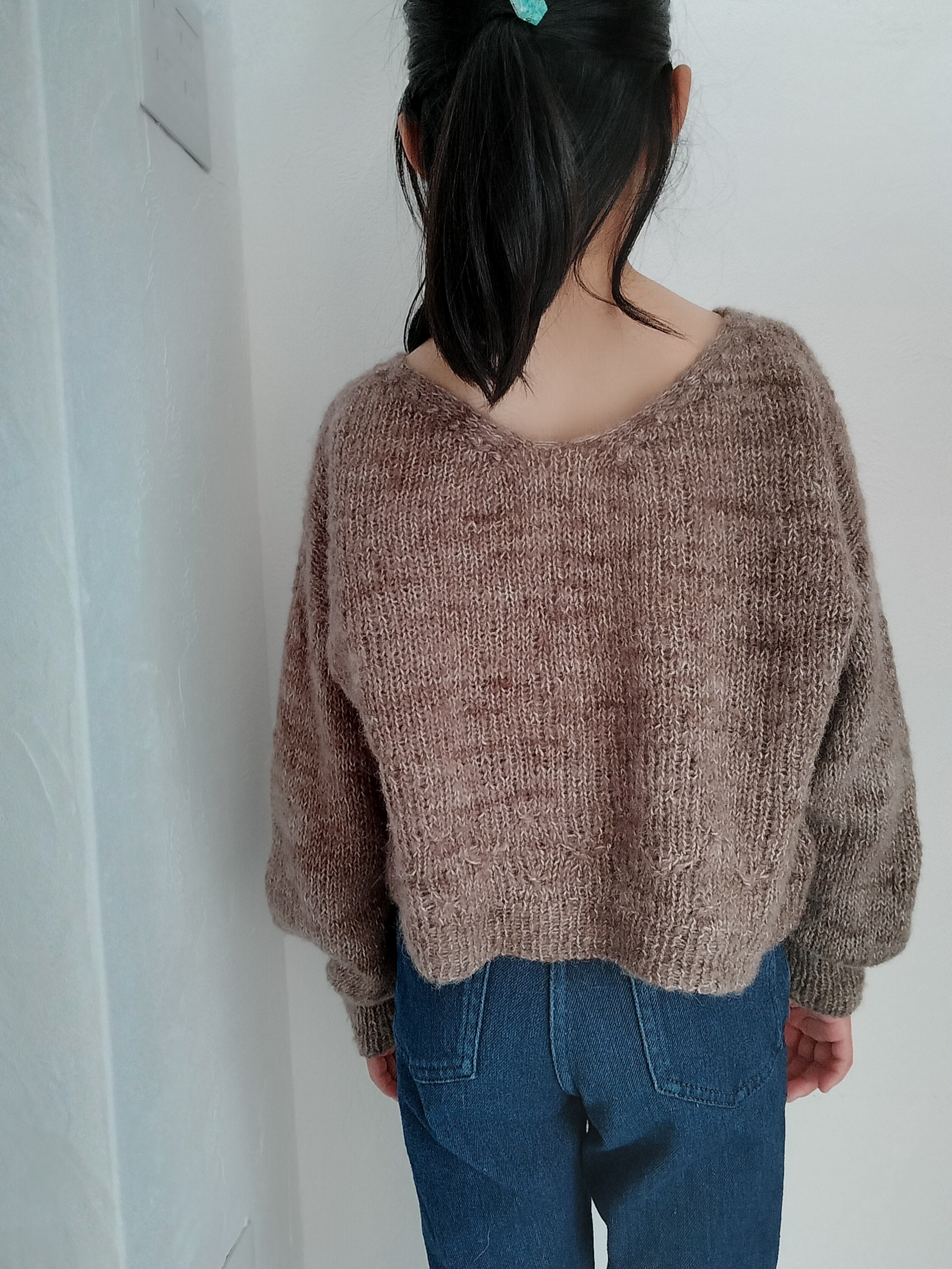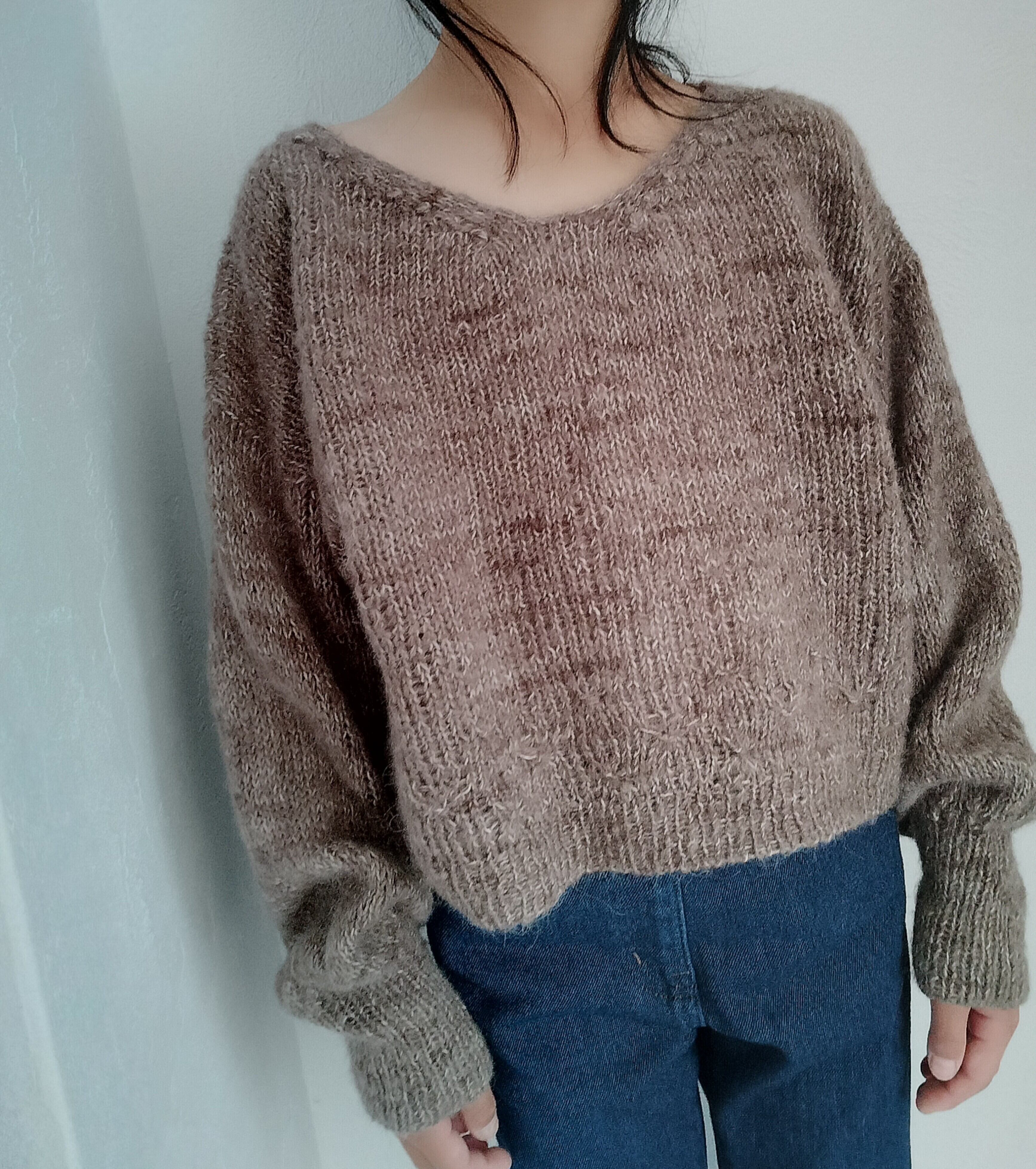 裾から輪でゴム編みと、Watage stitchを編みます。前後の身頃に分けてそれぞれを往復で編み、襟はwatege stitchを編みながら形を作っていきます。目を拾って袖を編みます。 ドロップショルダーでバストは30-40cmの余裕をもって着られる、ゆとりのある形にしています。前後を逆にしても着ることができるセーターです。綿毛のイメージでサンプルはモヘアで編みました。編む糸によって表情や着心地も変わると思います。ぜひいろいろな糸で編んでみてほしいです。