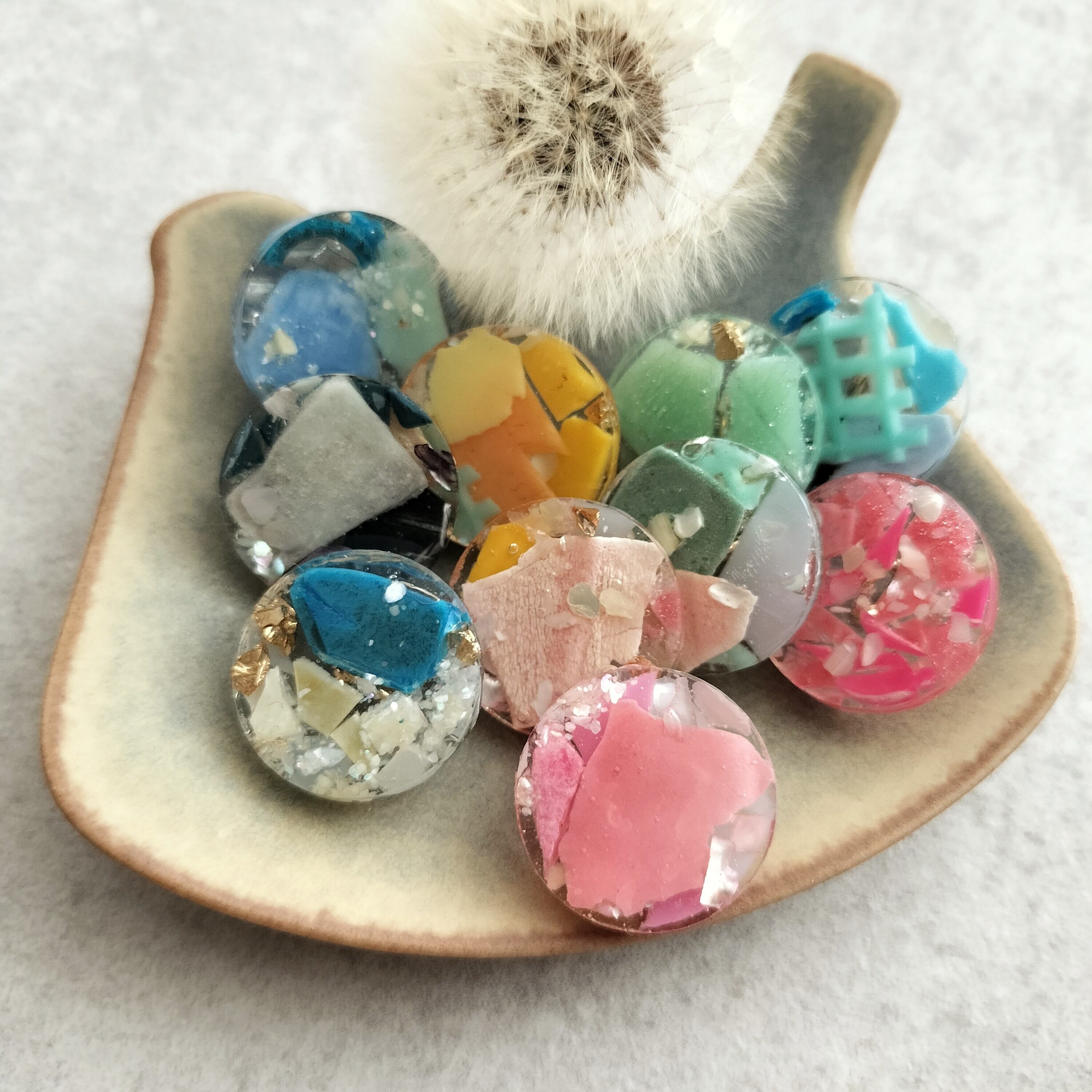 平らなパーツの中に、色や形の個性豊かな海洋プラスチックが入っており、厚みに個体差があります。劣化予防、表面の美しさを求めて十分なコーティングを施していますが、とくに裏面に緩やかな凹凸が残っているものもあります。